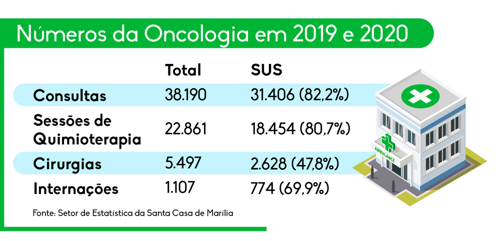 Em pleno processo de expansão, o Centro de Oncologia da Santa Casa de Misericórdia de Marília atende grande fluxo de pacientes da região do DRS IX (Departamento Regional de Saúde). Em 2020 e 2019, a unidade hospitalar filantrópica mariliense teve 5.497 cirurgias oncológicas realizadas em suas dependências, sendo 2.628 (47,8%) via SUS (Sistema Único de Saúde). Total de 38.190 consultas de pacientes com câncer também foram efetivadas no mesmo período, sendo que a grande maioria, 31.406 (82,2%), através do SUS.