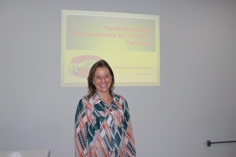 A enfermeira e psicóloga Flávia Cristina Castilho Caracio, que é mestra (Famema e Unesp) e doutora (USP) ministrou o primeiro módulo: “Fundamentos e Referenciais do Cuidado Paliativo”.
