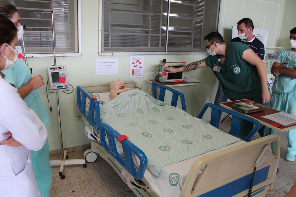 Na simulação realística, cenário com leito de enfermaria foi montado para dinâmica de identificação dos pontos de riscos de infecção, com o intuito de reforçar a higienização das mãos em cinco momentos.