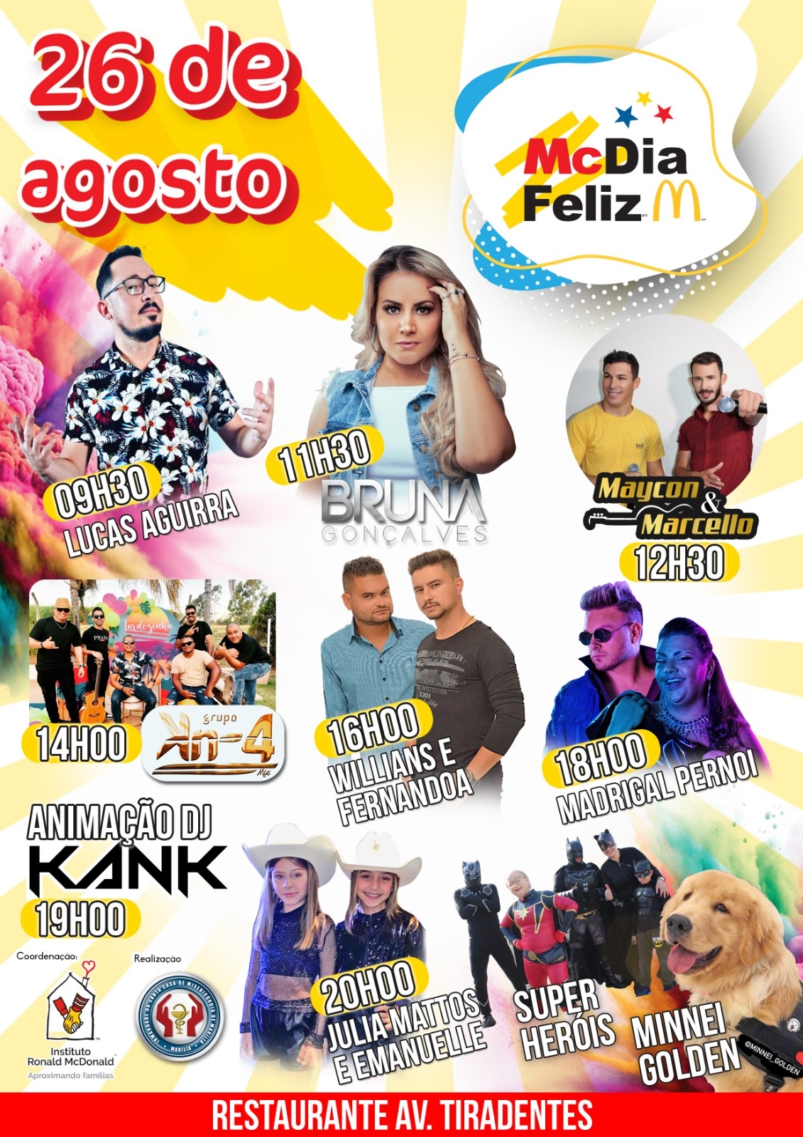 Os shows musicais terão início às 9h30, na lanchonete do McDonald’s da avenida Tiradentes. A abertura oficial com a presença de autoridades está marcada para as 10h. Além de diversos cantores, duplas sertanejas e Djs, o McDia Feliz em Marília também vai contar com a presença dos super-heróis, dos Plantonistas por Amor e da Klínica da Alegria.