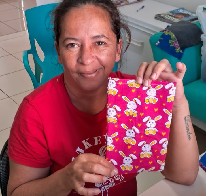 Os materiais utilizados são: tecidos, linhas, agulhas, tesouras, ferro de passar e máquinas de costura. Para atuar como instrutora foi convidada voluntária com experiência e habilidades em costura.