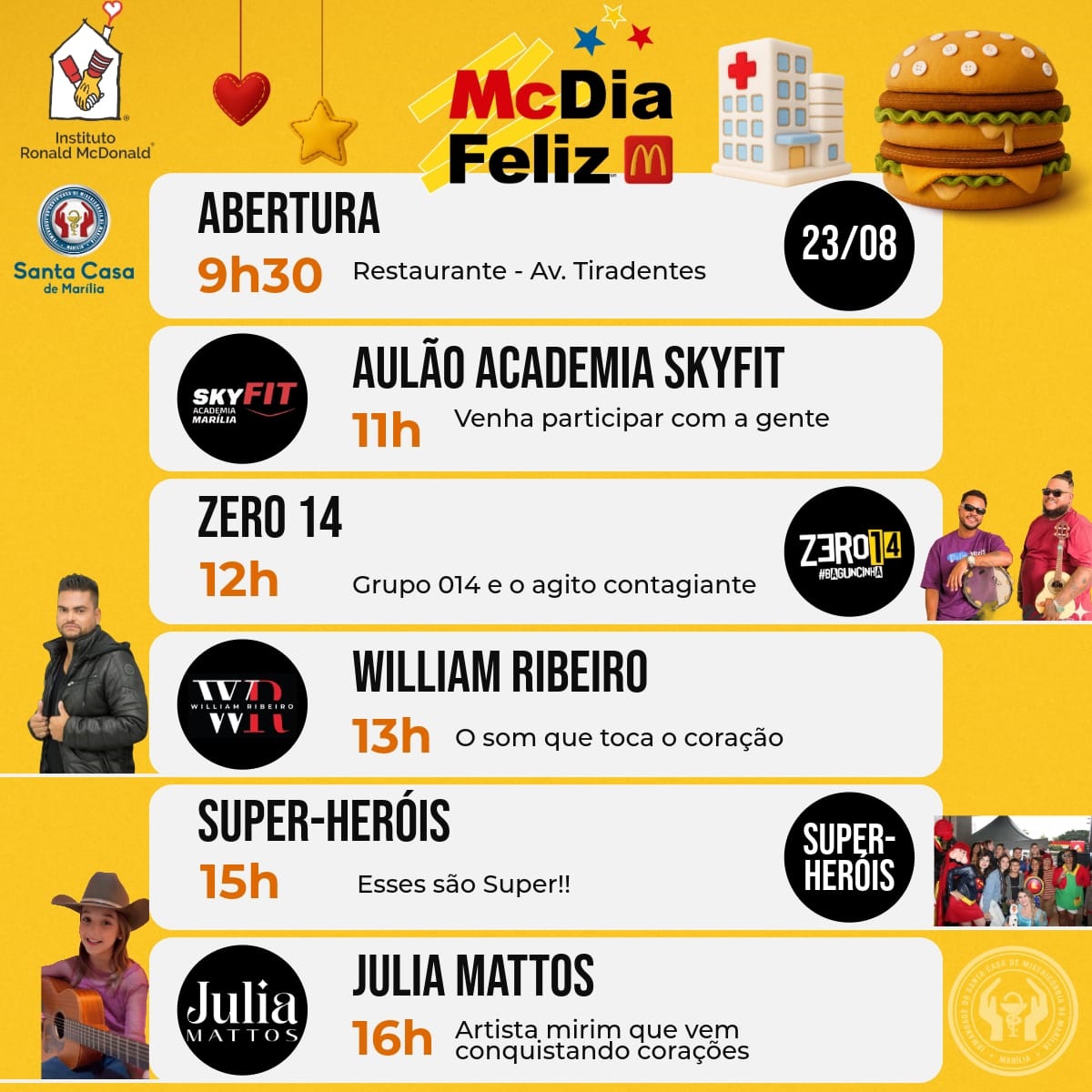 Shows artísticos, voluntários caracterizados de super-heróis e personagens infantis, além de outras atrações estão previstas para o McDia Feliz deste ano. O tíquete do sanduíche Big Mac custa R$ 20,00 e pode ser adquirido na própria Santa Casa de Marília.