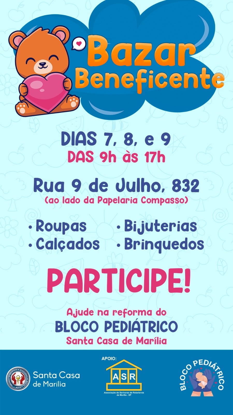Em parceria com a ASR (Associação de Senhoras de Rotarianos), será realizado nestes dias 7, 8 e 9 de outubro, das 9h às 17h, em espaço na rua Nove de Julho, 832 (centro da cidade) - ao lado da Papelaria Compasso - Bazar Beneficente em prol da reforma e ampliação do Bloco Pediátrico da Santa Casa de Marília.