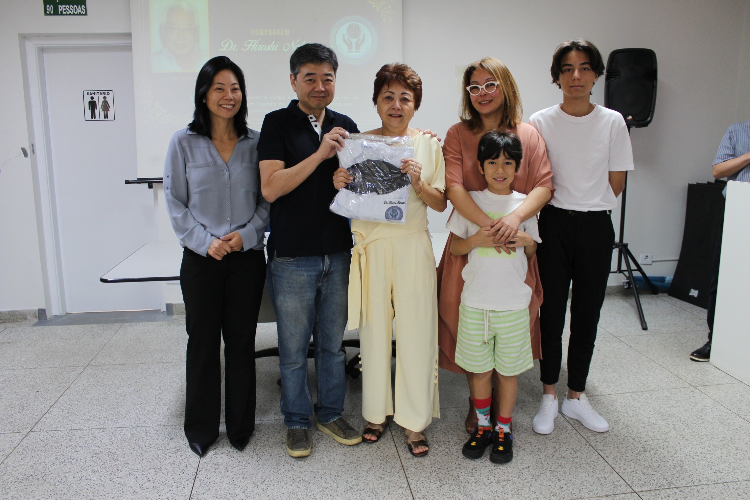 A esposa do homenageado, Sônia Nakano e os filhos Hiroshi Junior, Patrícia e Fabiana receberam flores e uma placa de metal com menção especial ao neurocirurgião. Além disso, novo jaleco com a logo do serviço de Neurocirurgia da Santa Casa de Marília “Hiroshi Nakano” também foi entregue aos familiares do médico.