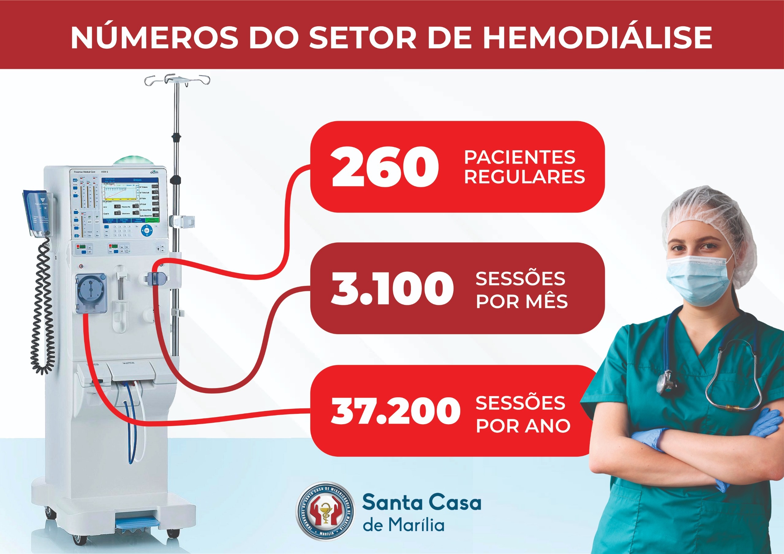 Atualmente, o setor conta com 63 máquinas e 56 pontos de hemodiálise, realizando mais de 3.100 sessões por mês, sendo mais de 90% dos atendimentos via SUS (Sistema Único de Saúde).