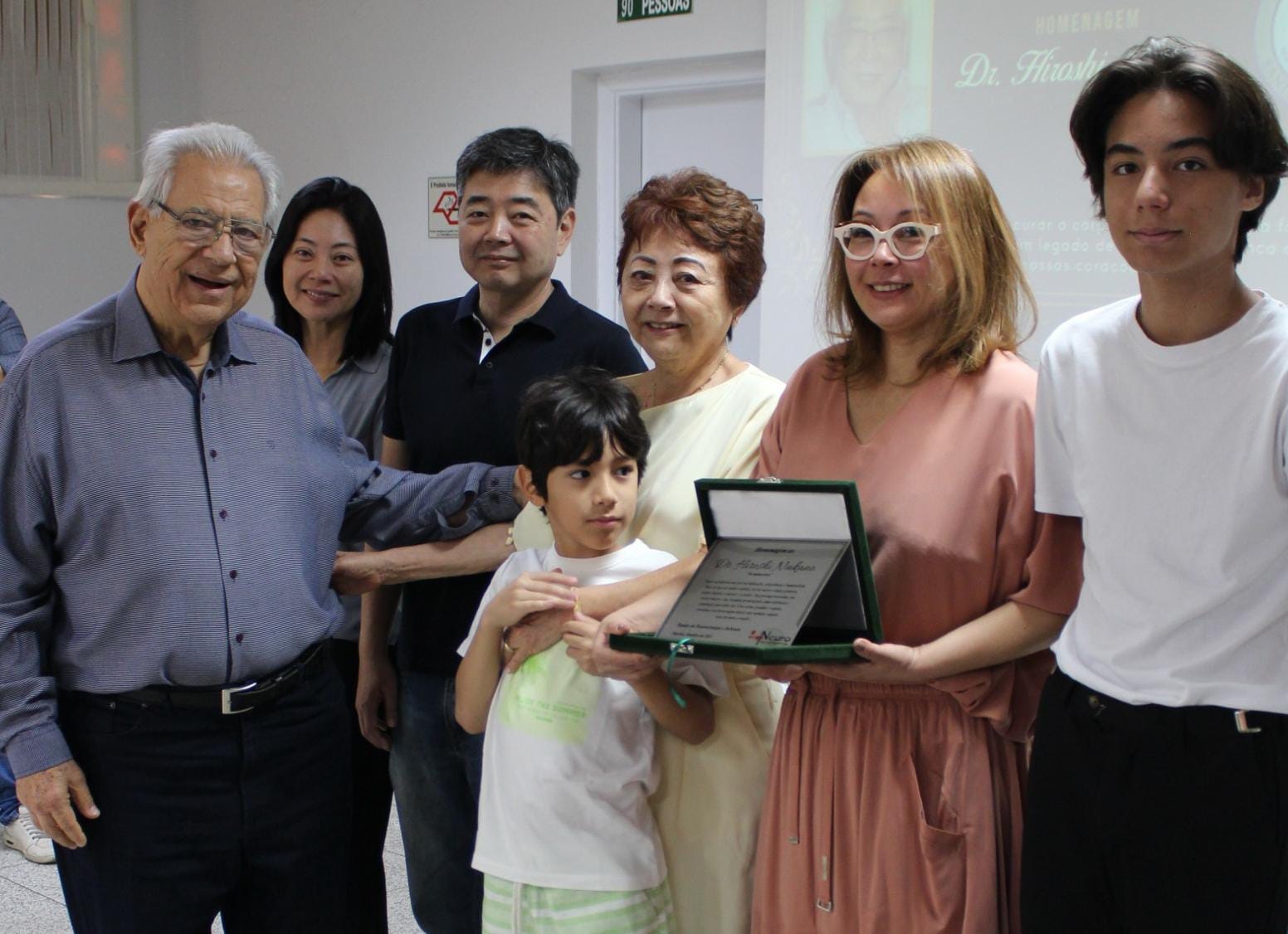 A esposa do homenageado, Sônia Nakano e os filhos Hiroshi Junior, Patrícia e Fabiana receberam flores e uma placa de metal com menção especial ao neurocirurgião. Além disso, novo jaleco com a logo do serviço de Neurocirurgia da Santa Casa de Marília “Hiroshi Nakano” também foi entregue aos familiares do médico.