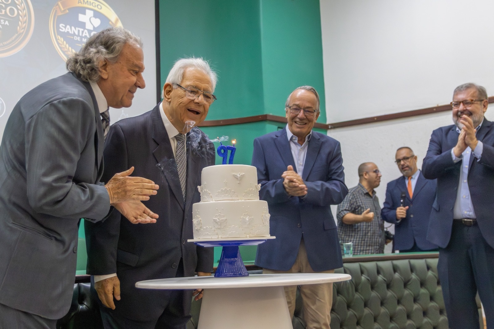 Ao final da solenidade, os presentes entoaram os parabéns à instituição aniversariante e participaram de uma foto comemorativa. O evento foi encerrado com um coquetel, que incluiu bolo de aniversário, reforçando o clima de celebração e união entre todos os participantes.