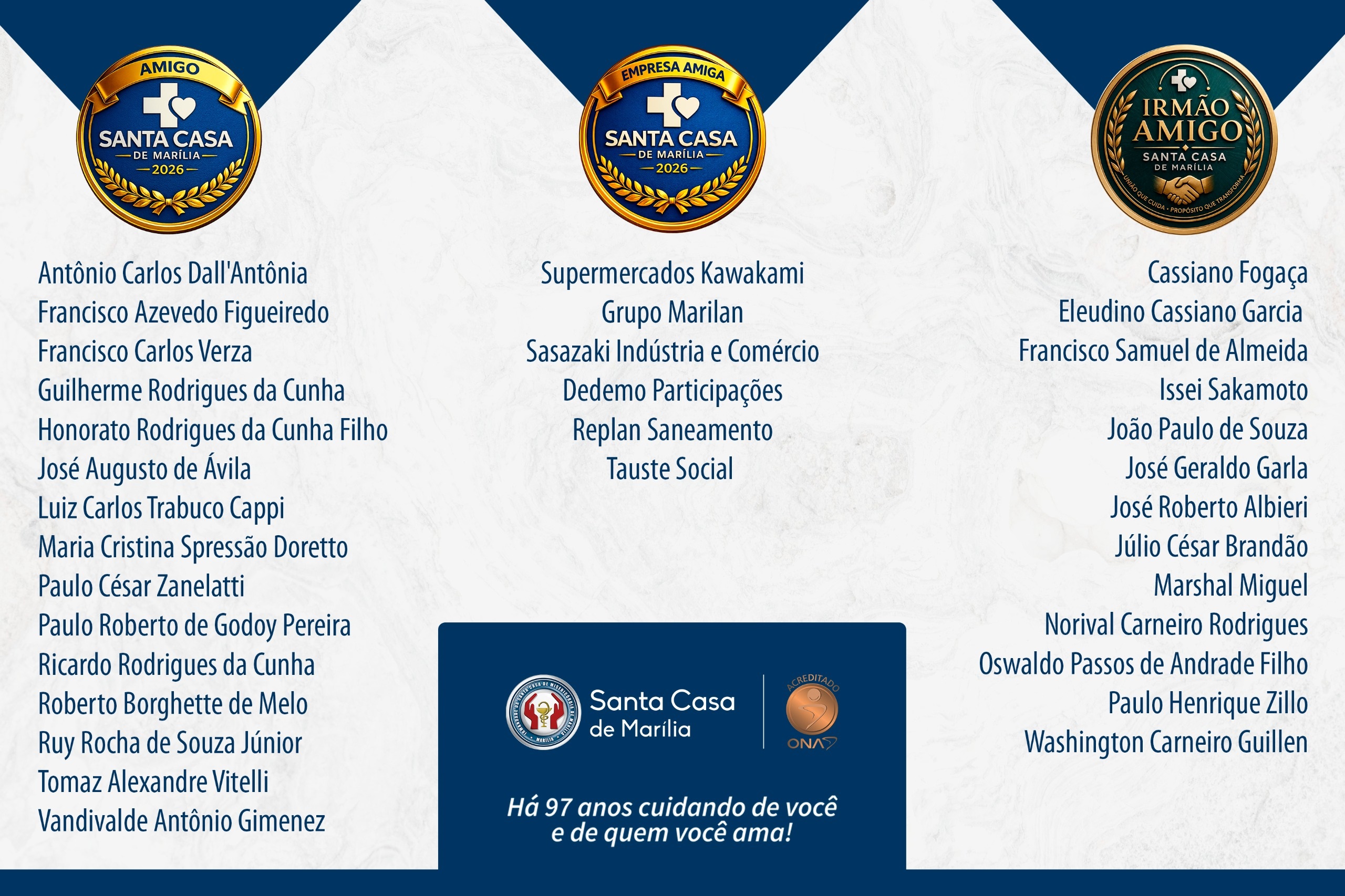 A noite do dia 22 de abril foi marcada por reconhecimento e emoção durante evento comemorativo realizado na Casa do Médico, celebrando os 97 anos da Santa Casa de Misericórdia de Marília. Na ocasião, foram entregues certificados aos “Amigos”, “Empresas Amigas” e “Irmãos Amigos” da instituição, destacando o papel fundamental de parceiros e colaboradores na evolução da instituição, uma das principais prestadoras de serviços de saúde no interior de São Paulo.