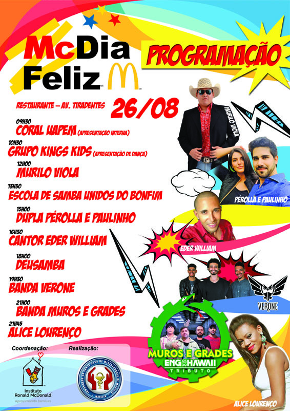 O Coral da Uapem abre a série de apresentações do McDia Feliz (9h30). Na sequência, estão previstos shows com o grupo Kings Kids (10h30); Murilo Viola (12h); Escola de Samba Unidos do Bonfim (13h30); Pérolla e Paulinho (15h); Éder William (16h30); Deu Samba (18h); Banda Verone (19h30); Banda Muros e Grades (21h); e Alice Lourenço (21h45).
