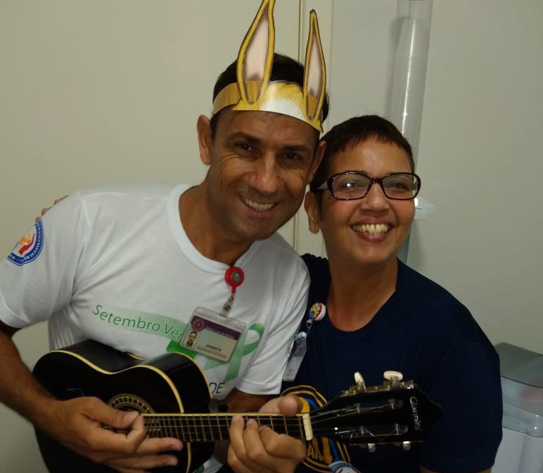 O coordenador da Portaria da Santa Casa, Donizete Munhoz, tocou cavaquinho e animou a confraternização para os pacientes da Oncologia Pediátrica na semana de Páscoa.