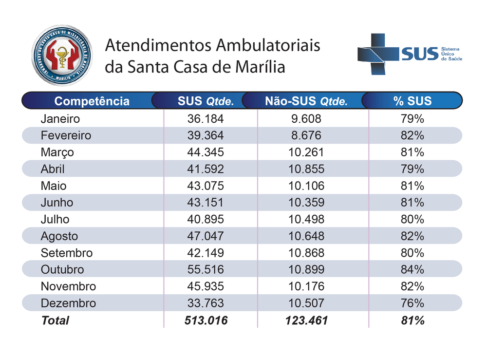 A Santa Casa de Misericórdia de Marília atingiu 81% de atendimentos através do SUS em seus ambulatórios. A estatística é referente ao ano de 2018 e aponta 513.016 procedimentos ambulatoriais realizados pelo Sistema Único de Saúde e 123.461 Não-SUS.